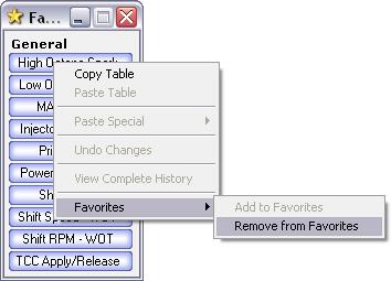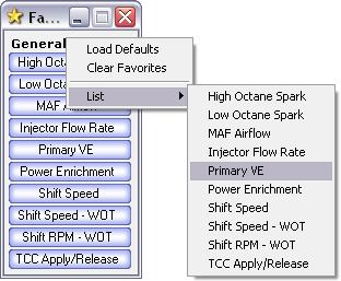 Any switch, constant or table in VCM Editor can be added as a favorite. Simply right click the button on any form you see it on and go down to the Favorites menu. This menu will allow you to add and remove favorites from your master favorites window.