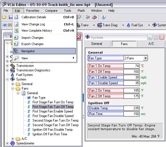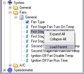 Tree style navigation in VCM Suite is a secondary navigational system. The reason it is called a secondary navigation system is that you will not find special forms like the OS Modifications, DTC List or Speedo Recalibration pages here.The tree lists intended use is for fast searching through parameters for quick changes. When you click on a parameter, a smaller navigator child window is displayed as shown above. The "System" window shown above only lists the parameters for the System->Fans->General grouping as indicated. When you click a parameter from another list in the tree style navigator, the current "System" window will be reloaded with parameters from the new group you have selected. When you click on tables, they will be opened up into their own table display window.